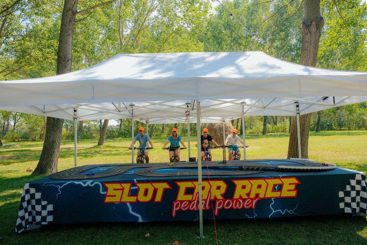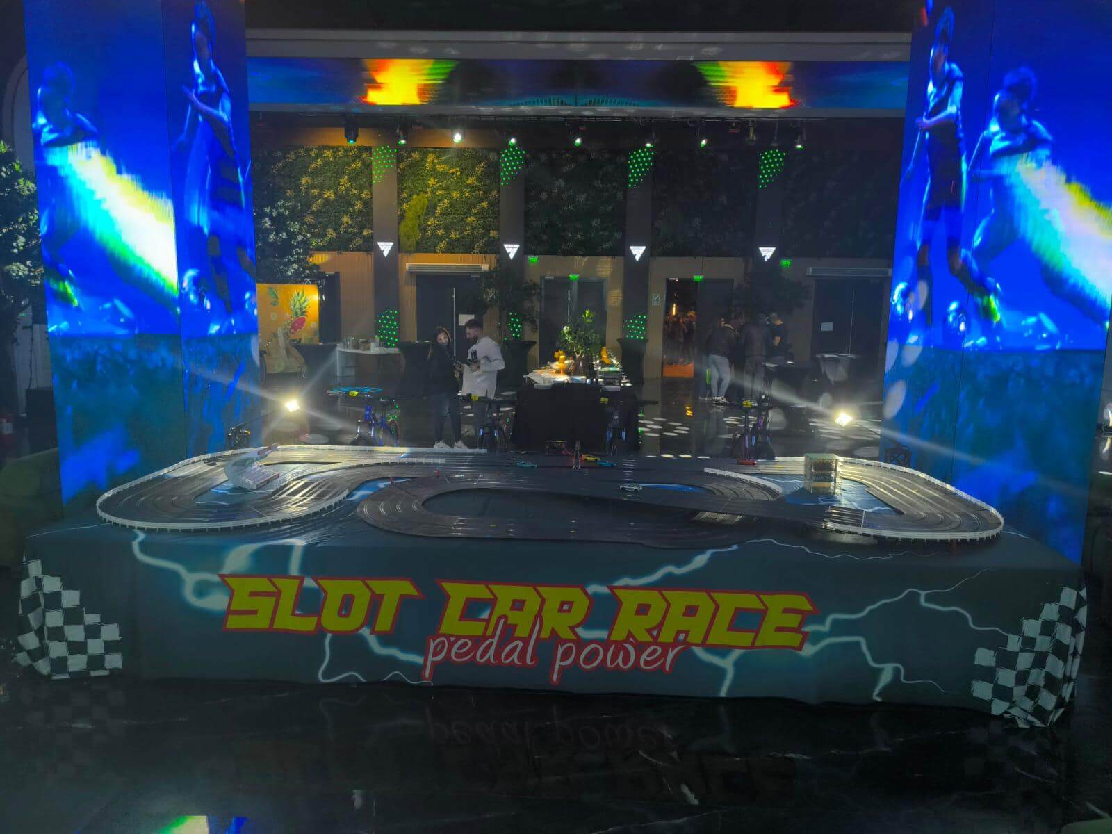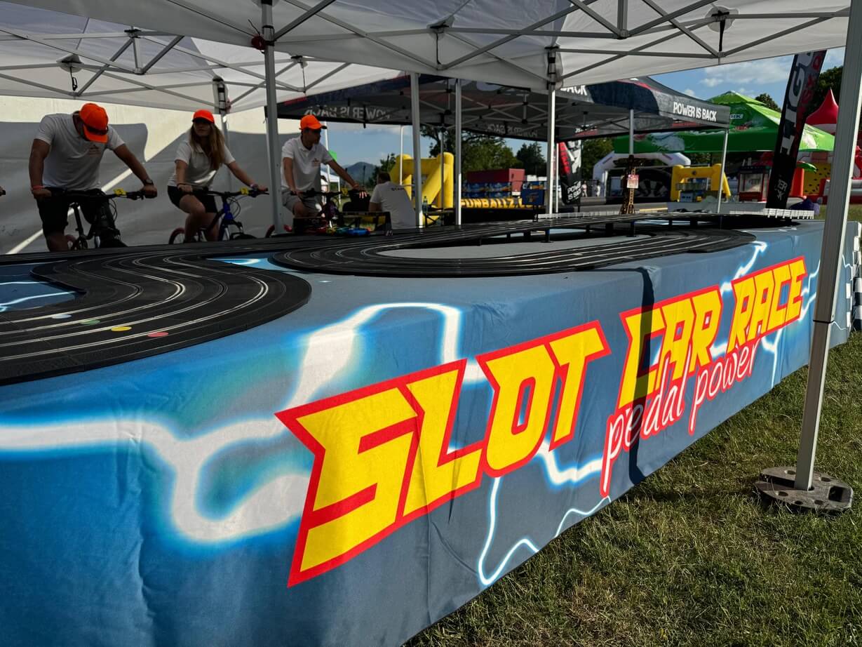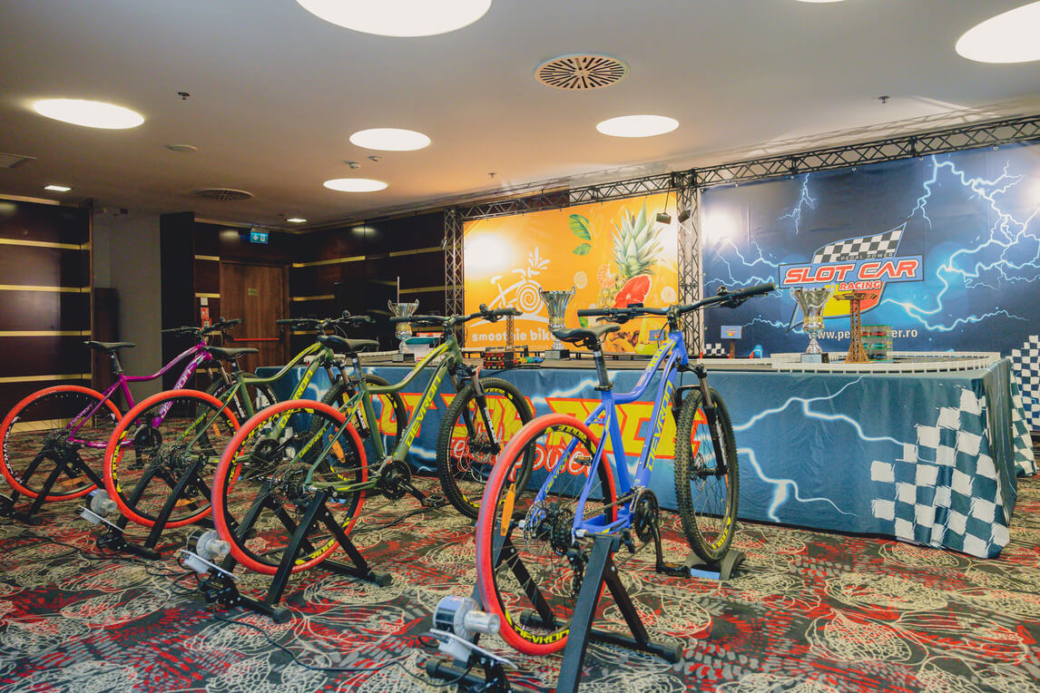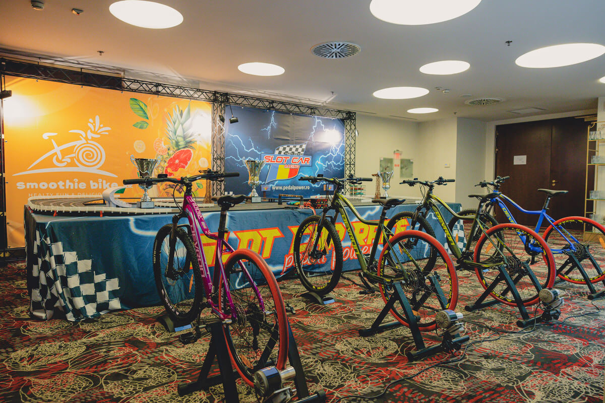 Imaginați-vă o competiție de curse palpitantă, unde viteza și controlul sunt în mâinile voastre – sau, mai bine spus, în picioarele voastre! Vă prezentăm o atracție revoluționară pentru evenimente: Pista de Slot Car cu patru benzi, alimentată de biciclete speciale, unde viteza de pedalare a participanților determină viteza mașinuțelor pe pista de curse. Această experiență unică combină activitatea fizică cu adrenalina curselor, oferind distracție maximă. Acest setup inovator este ideal pentru evenimente de toate tipurile, de la festivaluri și târguri la evenimente corporate, team-building-uri, team bonding, evenimenete wellbeing, evenimenete in centre comerciale…