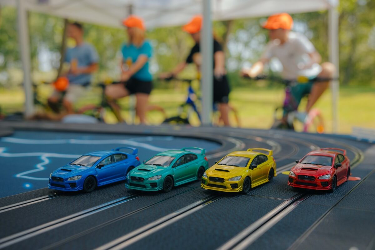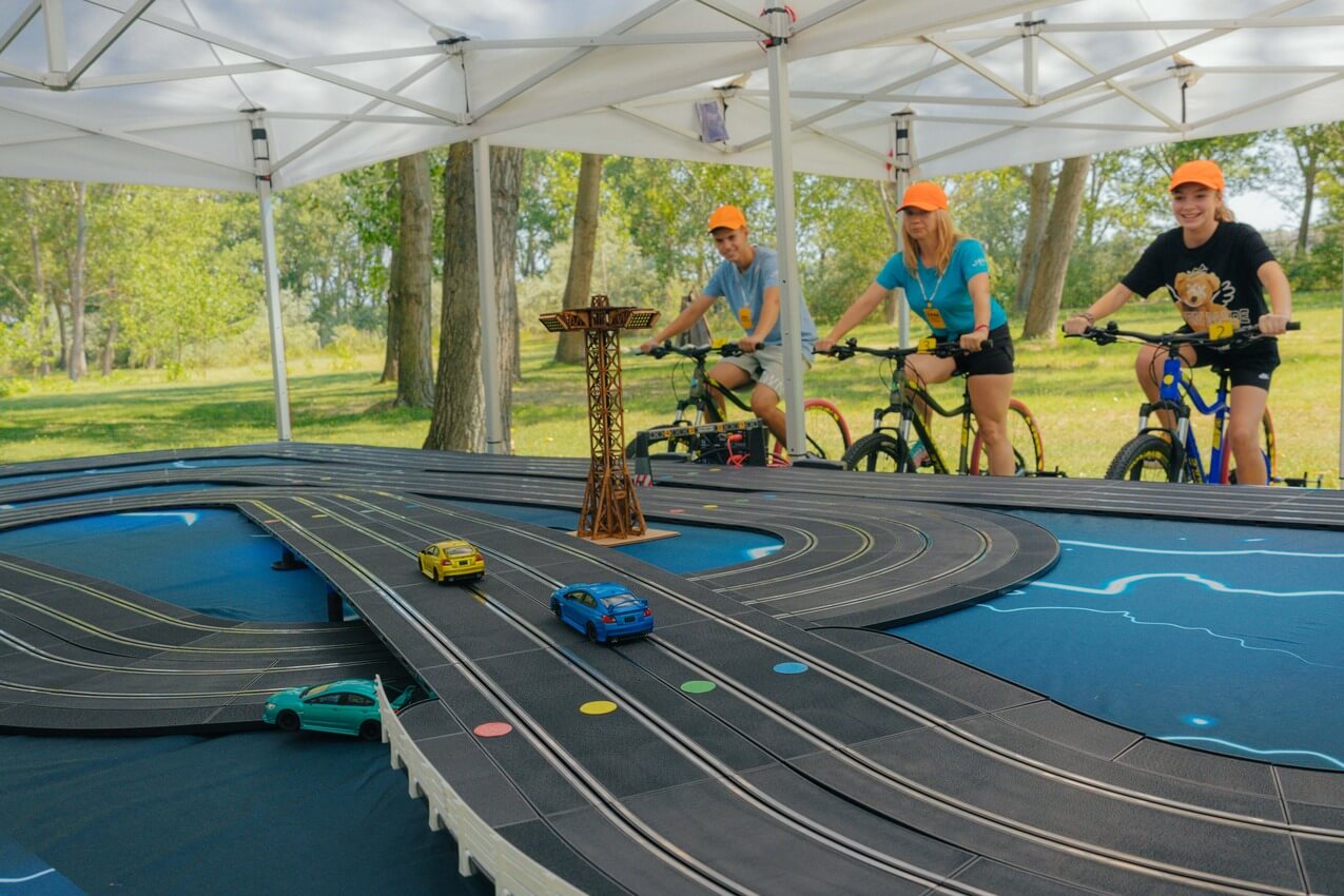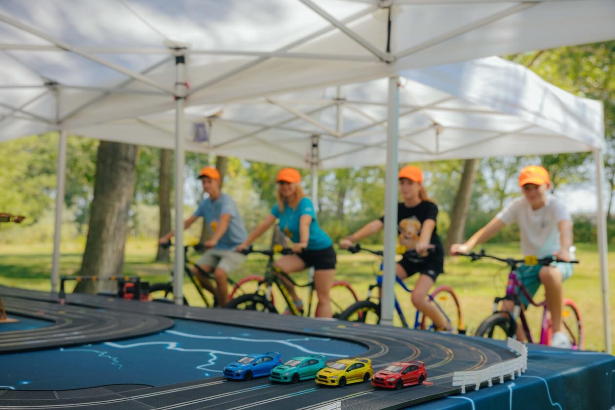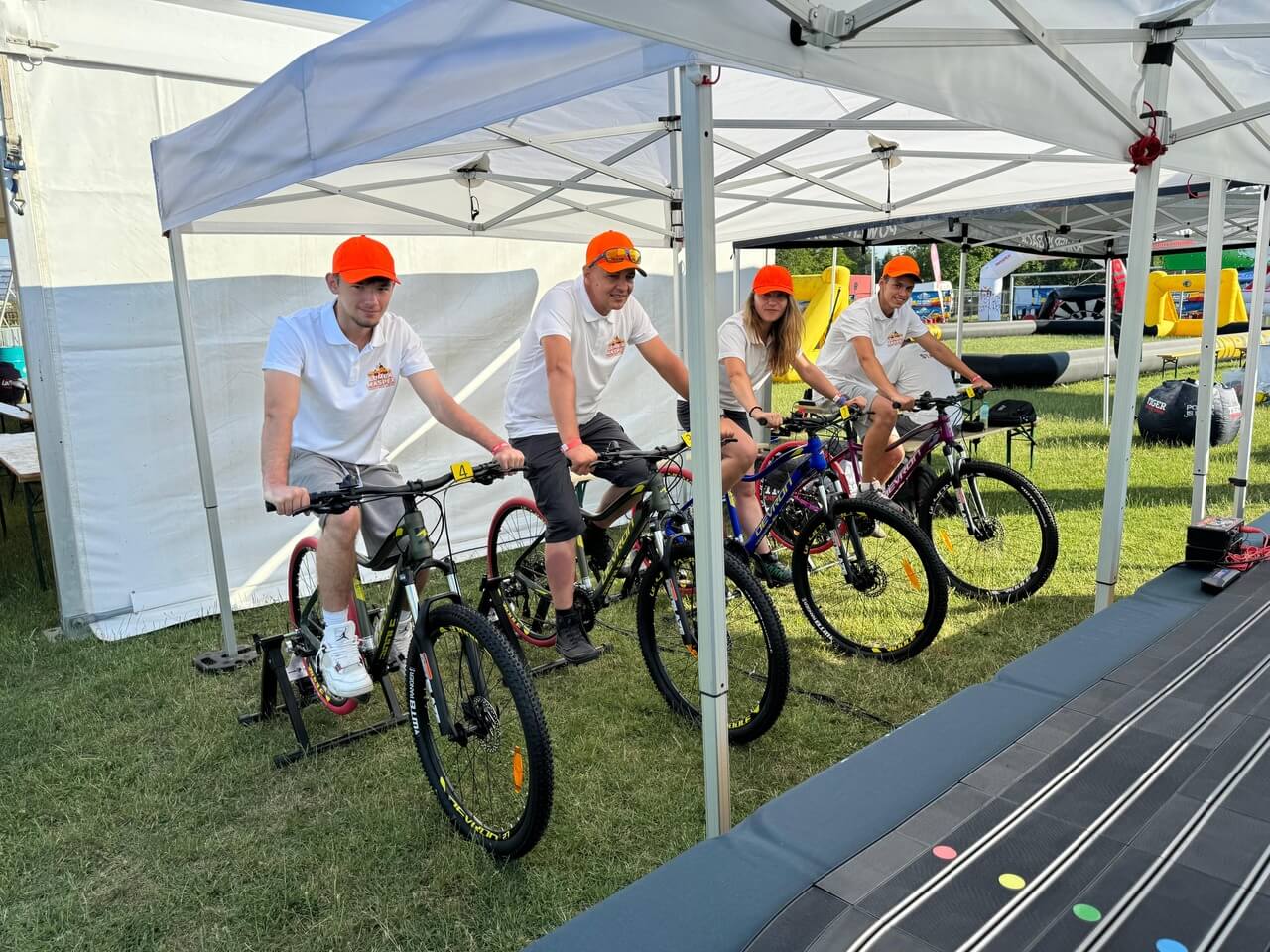 Imaginați-vă o competiție de curse palpitantă, unde viteza și controlul sunt în mâinile voastre – sau, mai bine spus, în picioarele voastre! Vă prezentăm o atracție revoluționară pentru evenimente: Pista de Slot Car cu patru benzi, alimentată de biciclete speciale, unde viteza de pedalare a participanților determină viteza mașinuțelor pe pista de curse. Această experiență unică combină activitatea fizică cu adrenalina curselor, oferind distracție maximă. Acest setup inovator este ideal pentru evenimente de toate tipurile, de la festivaluri și târguri la evenimente corporate, team-building-uri, team bonding, evenimenete wellbeing, evenimenete in centre comerciale…
